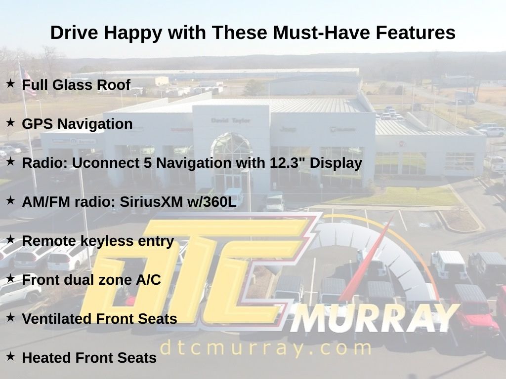 Step inside and you'll be surrounded by premium features that elevate your daily drive. The Uconnect 5 Navigation system with a massive 12.3-inch display puts all your favorite apps, music, and navigation at your fingertips. Enjoy the convenience of wireless charging, the comfort of heated and ventilated front seats, and the added security of 4G LTE Wi-Fi and Alexa Built-in.